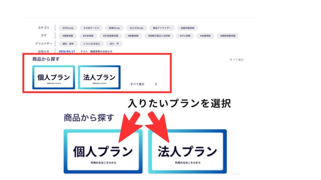 プラットフォームの商品を探す欄から「個人プラン」「法人プラン」をご選択ください。プランによって、動画が視聴できるプラン、できないプランがございますので、確認のうえ決済をお願いいたします。